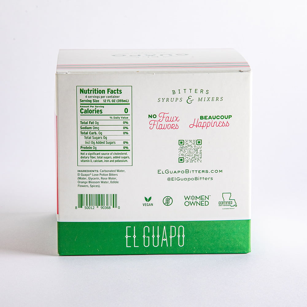 Our Love Potion Bitters & Soda is made with our award-winning Love Potion bitters. If floral drinks are your thing, this is the can for you. Subtle notes of chamomile, hibiscus, and orange blossoms lay beneath primary notes of rose, jasmine, and lavender.